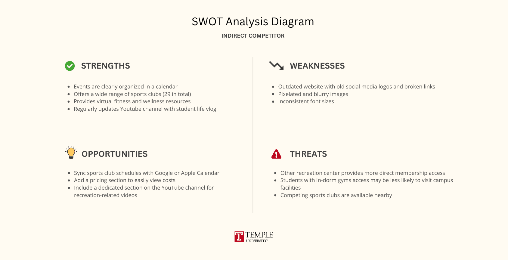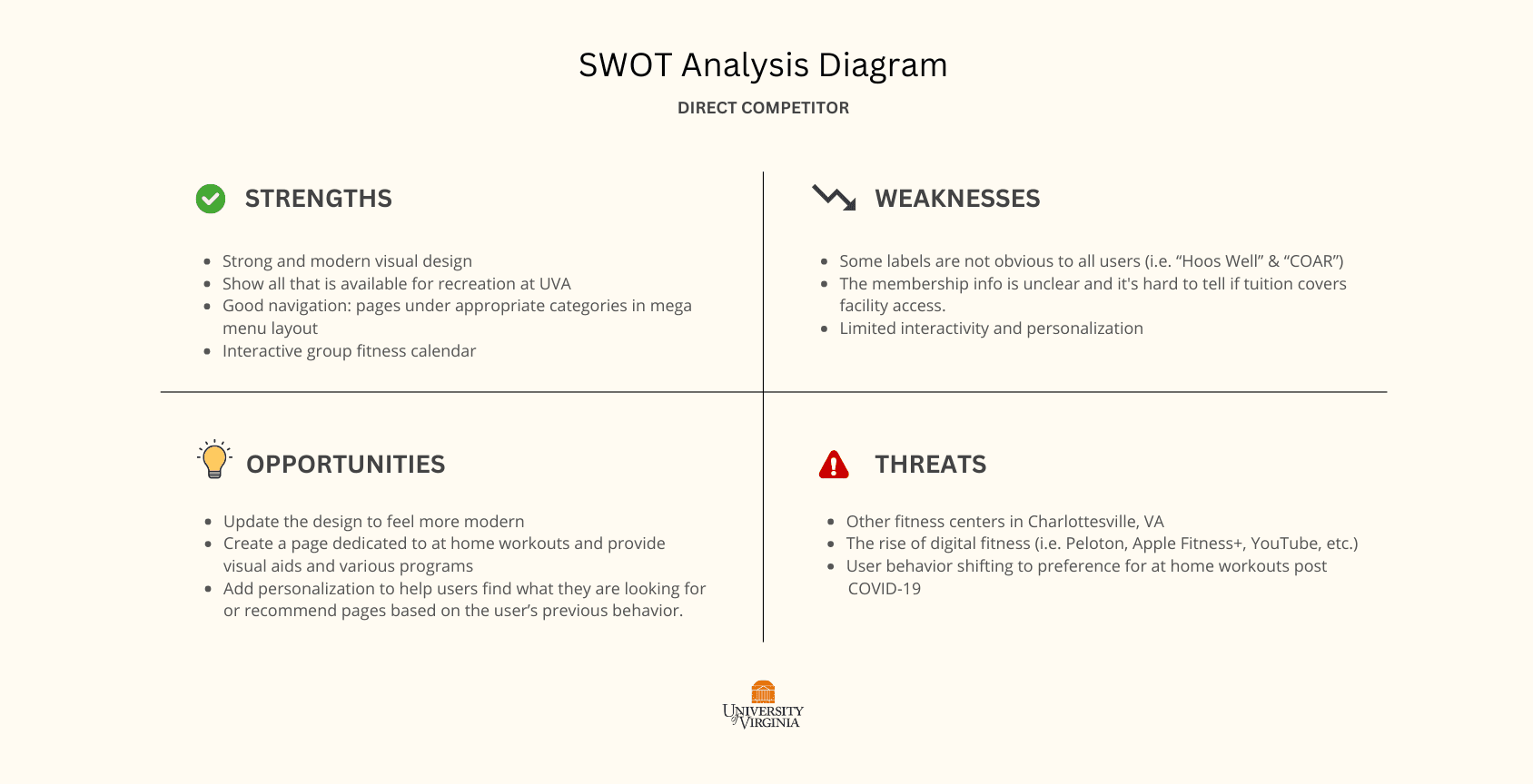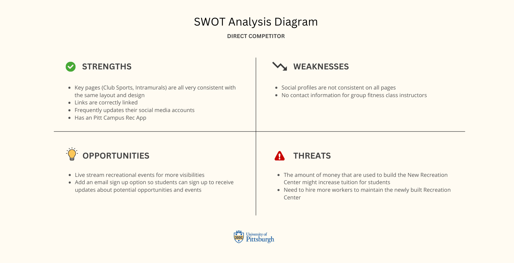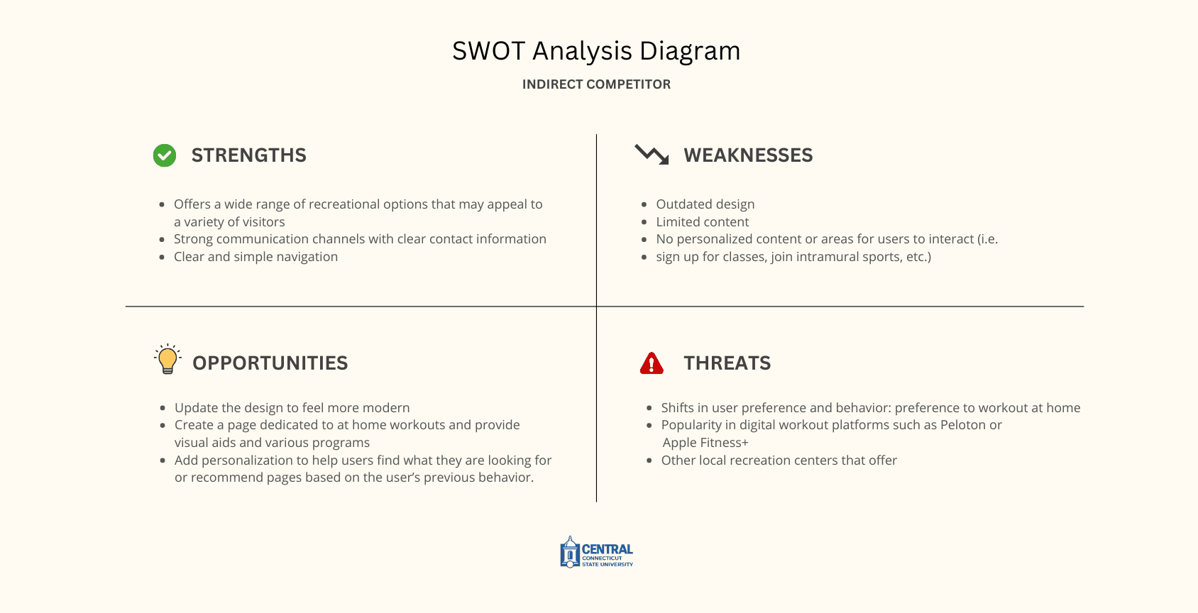 For the competitive analysis, we selected two direct competitors and two indirect competitors and conducted a SWOT analysis to evaluate their strengths, weaknesses, opportunities, and threats. From the analysis, we discovered several key takeaways. Competitors often feature strong visuals and well-organized navigation, areas where our site currently falls short. Many competitors also maintain frequently updated social media channels, providing a level of engagement we could improve upon. Additionally, their websites include interactive components, such as event calendars, to enhance user experience, whereas our site relies heavily on static elements like text and lacks high-quality imagery.