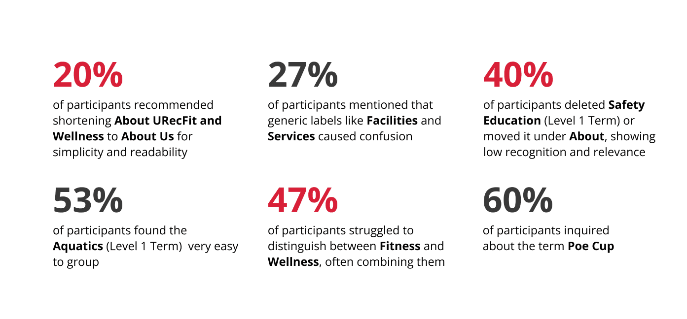 In our card sorting study, the goal was to understand how users naturally organize URecFit & Wellness content. A hybrid card sorting method was used to balance user freedom with structural guidance. Participants began by organizing Level 1 pages, where they could create, remove, or combine top-level categories as they saw fit. They then sorted Level 2 pages, which were provided in random order, into the established categories to reveal their natural grouping tendencies. Level 3 pages were excluded from this study. 15 participants were recruited from local communities, primarily students with active lifestyles.
