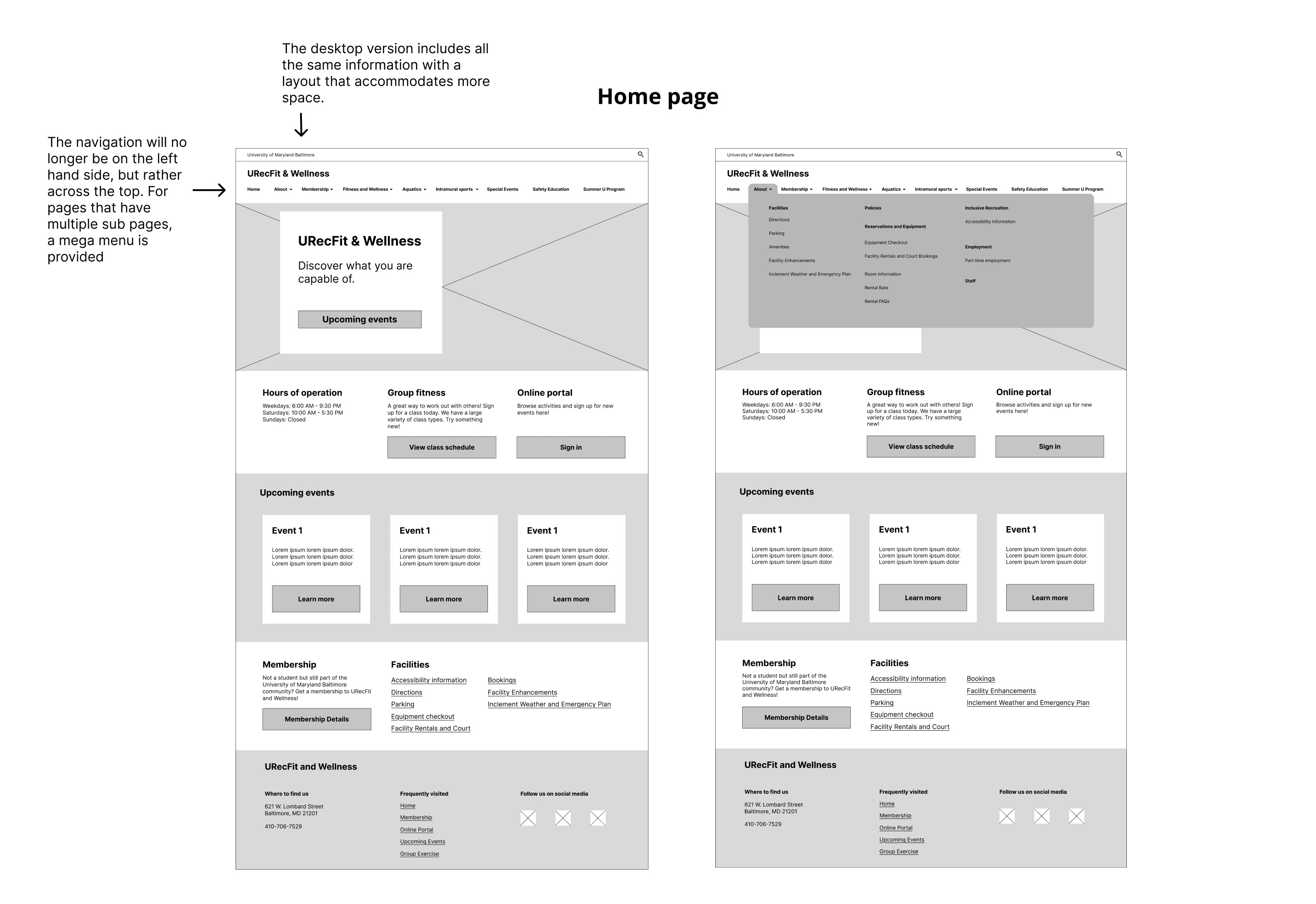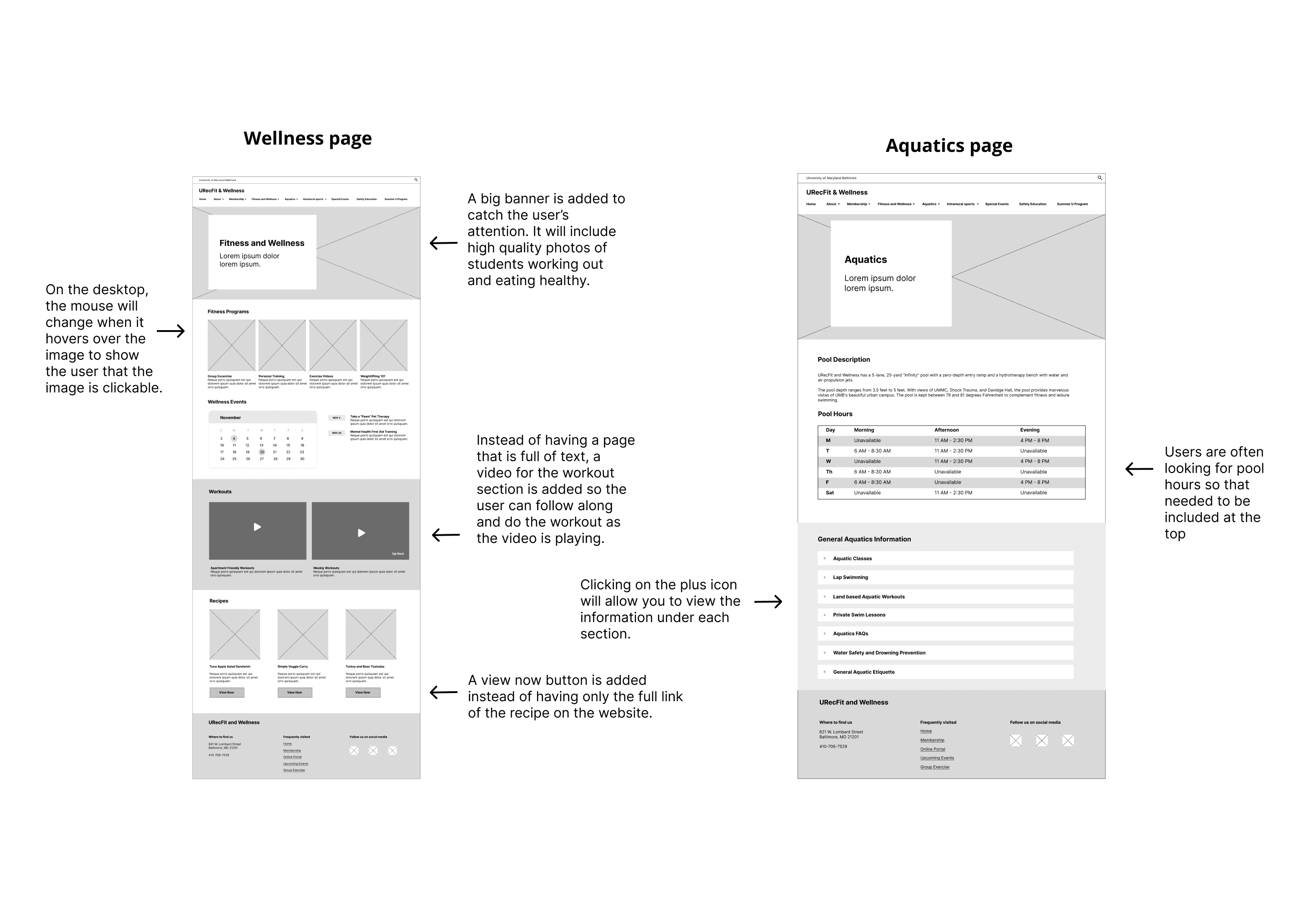 Based on the results and findings, the team decided to redesign the website pages to enhance user navigation and overall usability. The wireframes were divided among the group members; I was responsible for designing the Wellness page, while my classmate worked on the remaining pages.